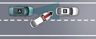 [A]: Your vehicle, [B]: Front vehicle If the vehicle in front makes a sharp turn, such as to turn left or right or make a U- turn, etc., Leading Vehicle Departure Alert may not operate properly.