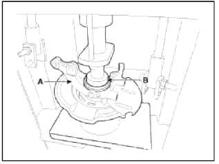 5. Remove the brake hose (A) and wheel speed sensor (B).