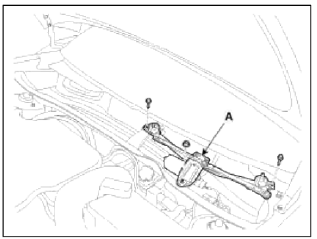 6. Remove the windshield wiper motor and linkage assembly (A) after removing 2 bolts and nut.
