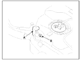5. Remove the fuel tank air filter and canister close valve assembly (A) after removing the installation nut (B).
