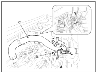 3. Disconnect the recirculation valve connector (A) and the vacuum hose (B), and then remove the intercooler inlet pipe assembly (C).